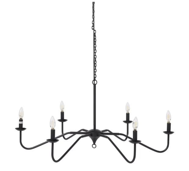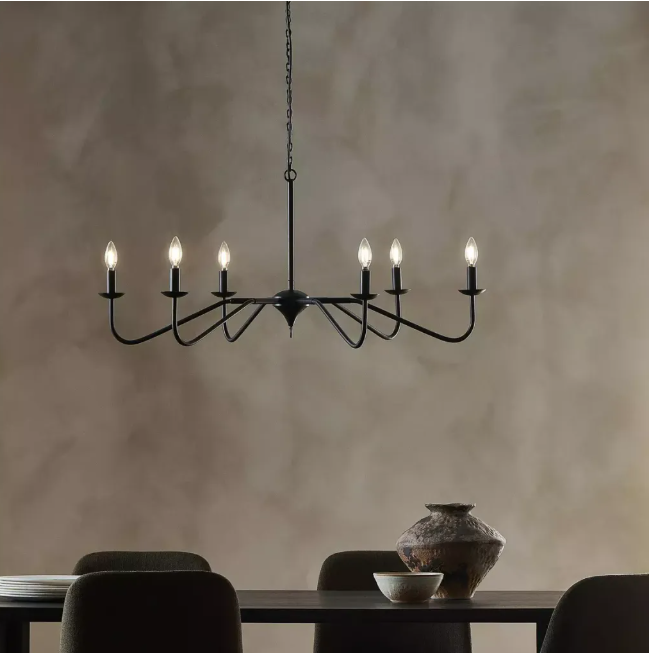 This French industrial-inspired, candelabra-style chandelier features slim lines of antique iron and tapered bobeches all around. This piece is compatible with sloped ceilings.