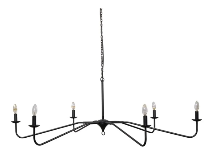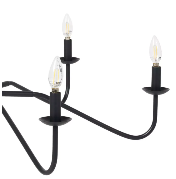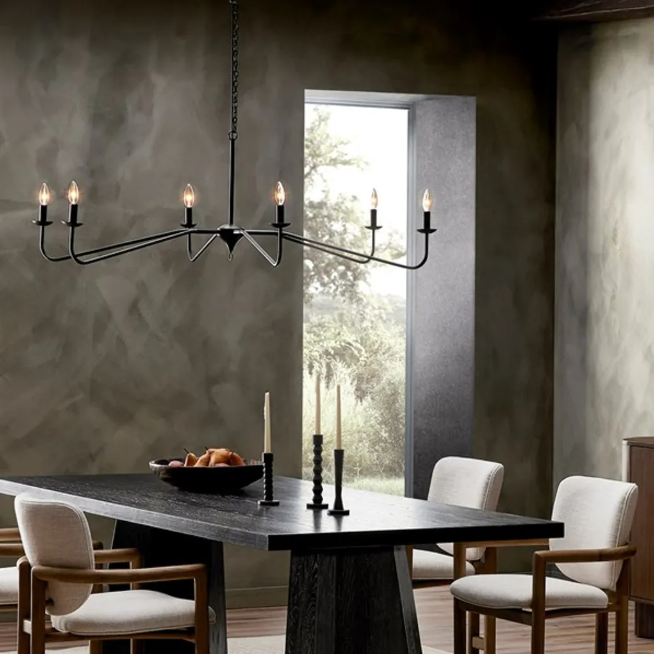 A grand statement piece, this French industrial-inspired, candelabra-style chandelier features slim lines of antique iron and tapered bobeches all around. This piece is compatible with sloped ceilings.