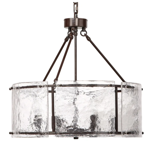 A refined study in contrasts, this striking chandelier features a softly curved slice of ice-like glass that softens and diffuses the "flame" of the bulbs behind it. A smooth oil-rubbed bronze canopy and chain perfectly complement the richly textured glass. Sophisticated yet simple, this is a beautiful choice for a modern interior.